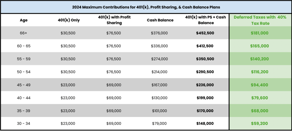 Combining a cash balance plan with a 401(k) profit sharing plan can produce the following tax deferrals: